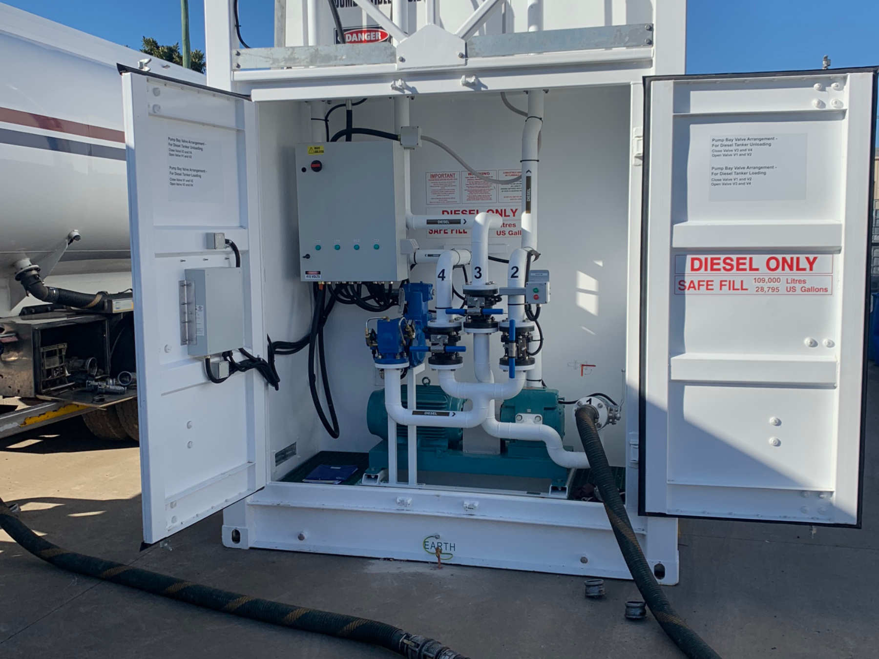 The design, construction, installation, and commissioning of a new 110,000L Diesel above ground storage system, with the high speed unloading pump also used to load tankers through a bulk loading arm.